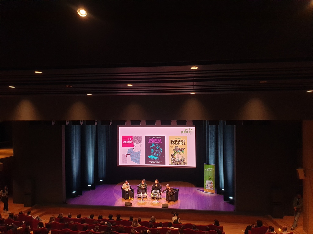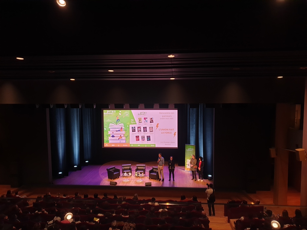 Le 6 mars dernier, les élèves inscrits au Prix Ados 2024-2025 ont eu l'opportunité de se rendre à Rennes pour assister à une rencontre littéraire. L'événement, qui s'est tenu dans l'auditorium des Champs Libres, a rassemblé près de 400 élèves venus échanger avec trois auteurs sélectionnés dans le cadre du prix : Ludovic Lecomte pour La Cabane, Hélène Lenoir pour Battlestar Botanica, et Adrien Tomas pour Règne animal.
