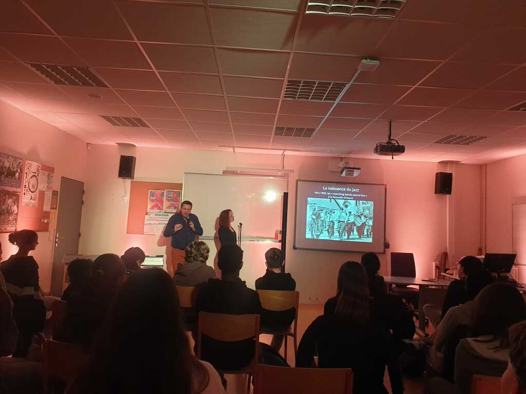 Chaque classe de 4ème a ainsi assisté à une conférence d’une durée de deux heures. Au fil de la séance, les artistes ont proposé un véritable voyage à travers l’histoire de la musique afro-américaine, en montrant à quel point celle-ci est intimement liée à l’histoire de l’esclavage.