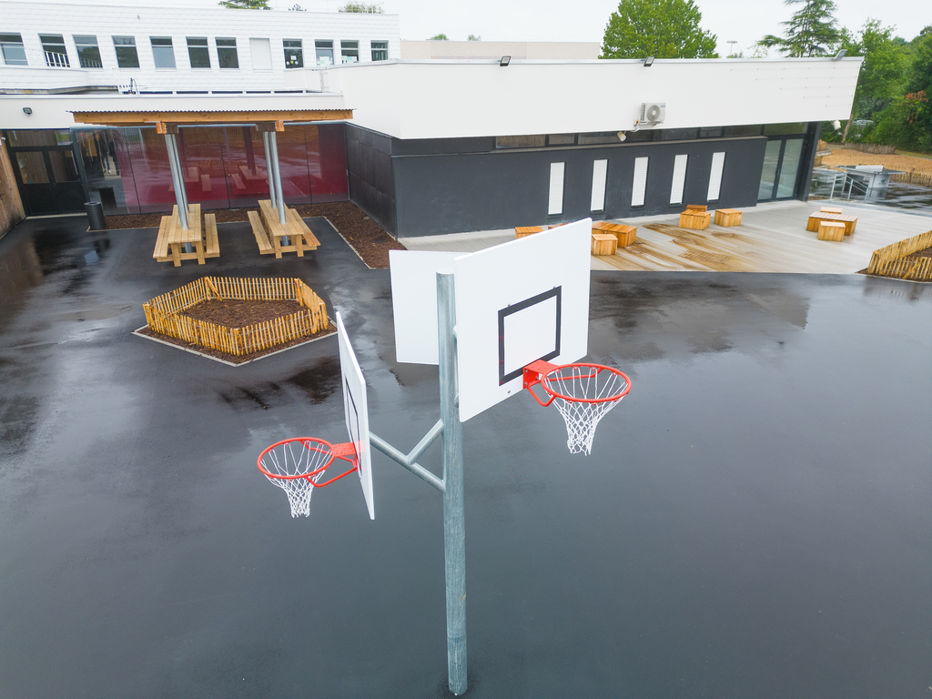 La nouvelle cour du collège Jacques Prévert se décline désormais en plusieurs espaces distincts, chacun répondant à des besoins variés. Une cour active permet aux élèves de se défouler et de pratiquer différents sports, avec notamment un panneau de basket multi-niveaux. À côté, une zone plus calme, d’une taille équivalente à la cour active, offre des espaces de détente et de réflexion, idéals pour ceux qui préfèrent se poser ou travailler en groupe.