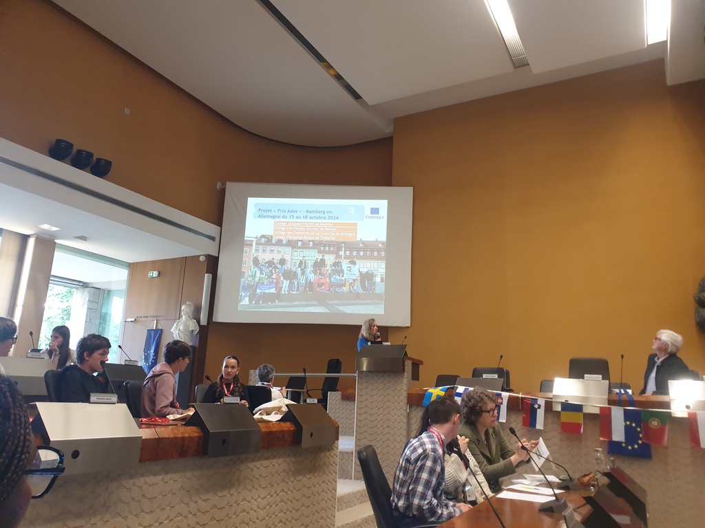 Parmi les dix collèges ayant bénéficié cette année d’une mobilité dans le cadre du programme Erasmus+, quatre d'entre eux ont participé au projet Prix Ados. Les vingt ambassadeurs ont brillamment présenté leur mobilité lors du premier discours de présentation de la journée.